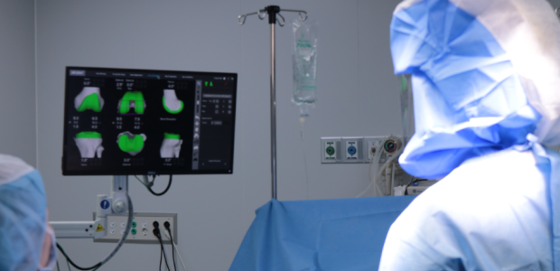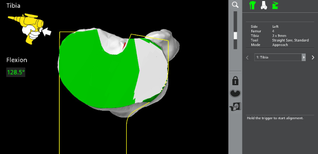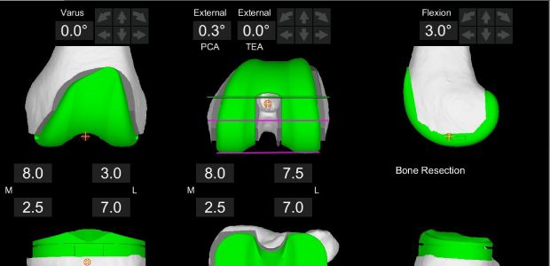 의사는 환자의 손상 범위와 인대 상태에 맞는 수술 계획을 세워 뼈를 절삭하기 전에 뼈의 절삭 범위와 삽입될 인공 관절의 크기, 위치 등을 실시간으로 미리 검토 합니다.