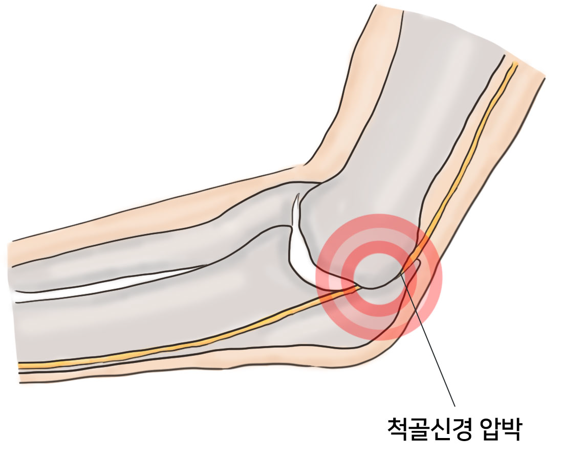 팔에는 척골신경, 정중신경, 요골신경이 분포해 있는데 이 중척골신경 터널이라 표현할 수 있는 인대의 구멍 사이를 지나갑니다. 이 터널이 좁아져서 신경이 압박되며 저림 증상과 진행하는 운동마비를 유발하는 질환을 팔꿈치 터널 증후군이라 합니다.