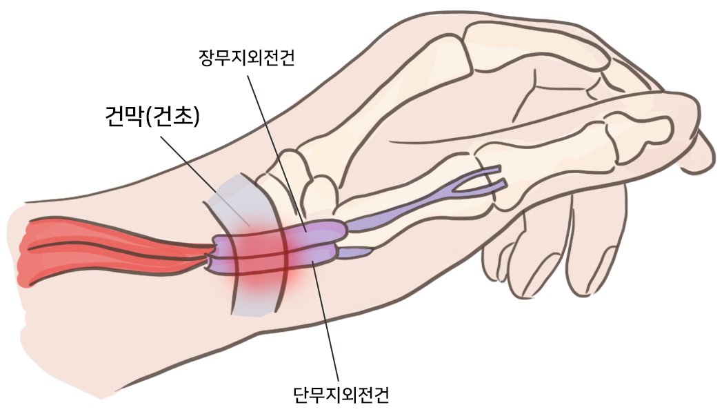 엄지손가락의 두 힘줄 (장무지 외전건, 단무지 신건)을 많이 사용해 발명하는 것이 일반적인 원인입니다.