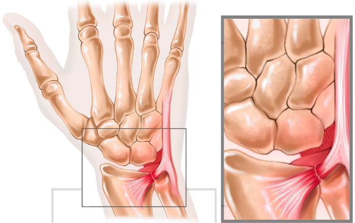 손은 손목을 이루는 큰 뼈인 요골과 척골 그리고 8개의 작은 뼈들이 뭉친 수근골로 이루어져 있습니다. 이 사이에는 삼각 섬유라 불리는 연골이 존재해 손목을 안정되게 움직일 수 있도록 도와줍니다. 이 삼각 섬유연골이 파열되어 통증을 유발하는 것을 삼각 섬유연골(TFCC) 파열이라 진단합니다.